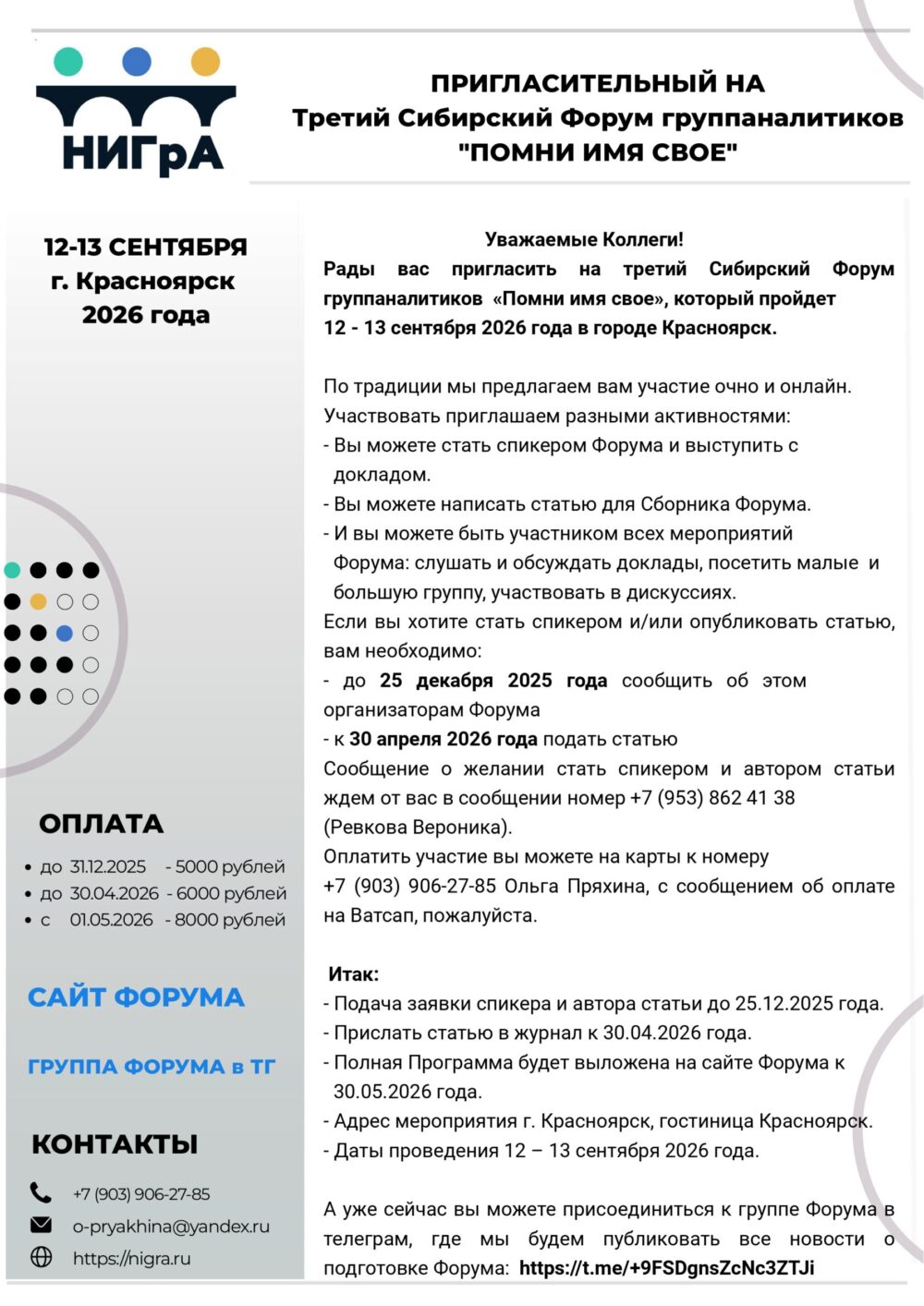 Наши коллеги из Ставропольской краевой психоаналитической ассоциации (СКПА) приглашают на мероприятие Группаналитического клуба «Трансформации образа группового аналитика» 25 мая 2024 г. Запись по тел.: 8-903-415-73-83 (Светлана Зюзякина)